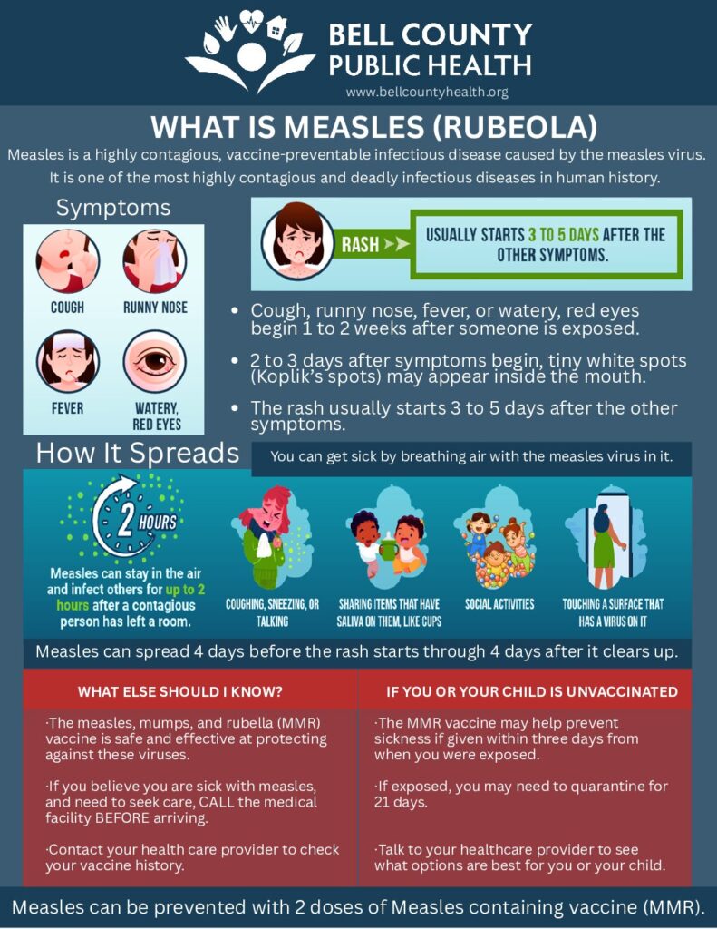 “The Bell County Public Health District urges residents to remain vigilant due to increased reporting of measles cases in Texas. If you are experiencing these symptoms and come to our Emergency Department, please call us at 254-690-0900 so we can prepare for your arrival.